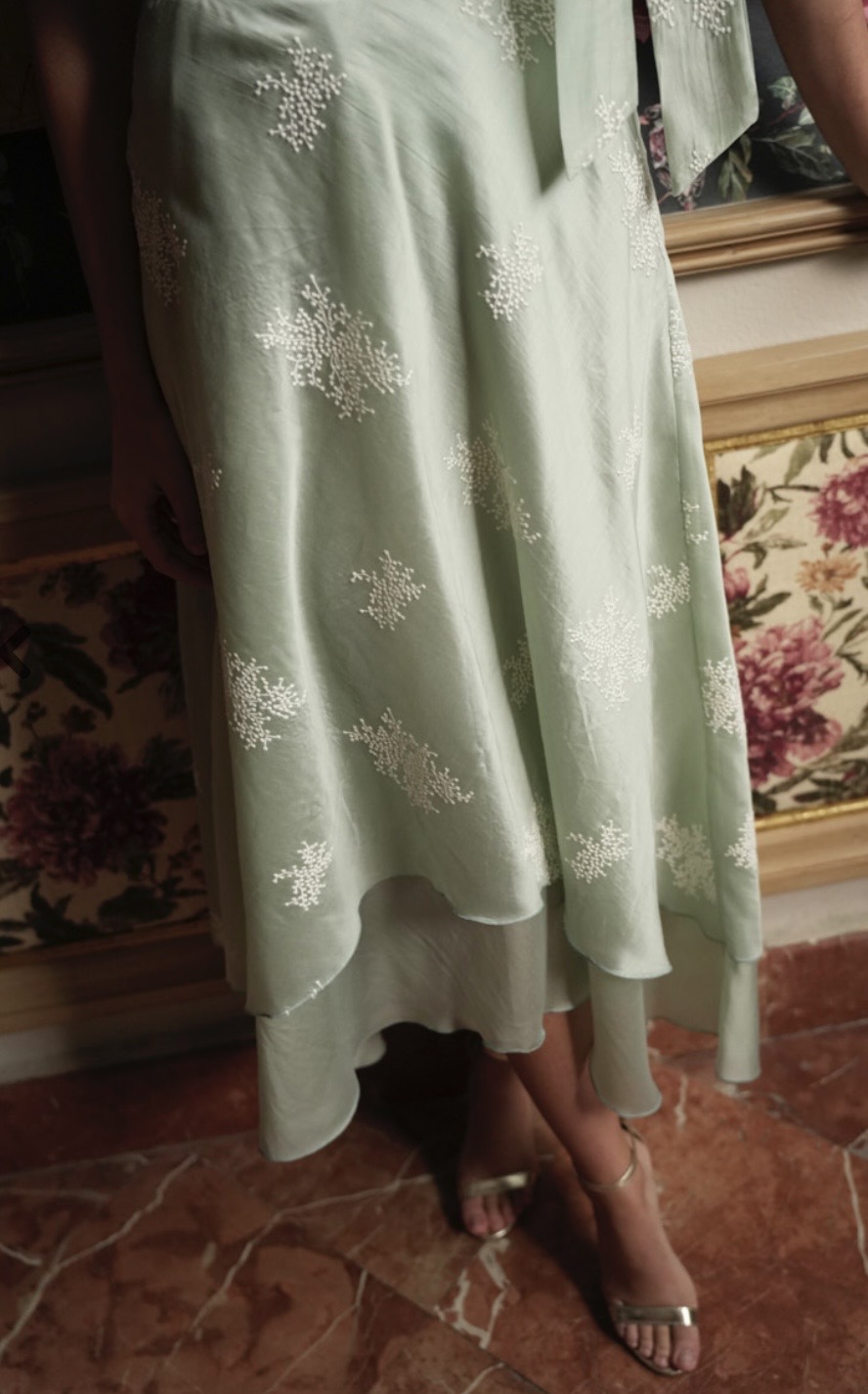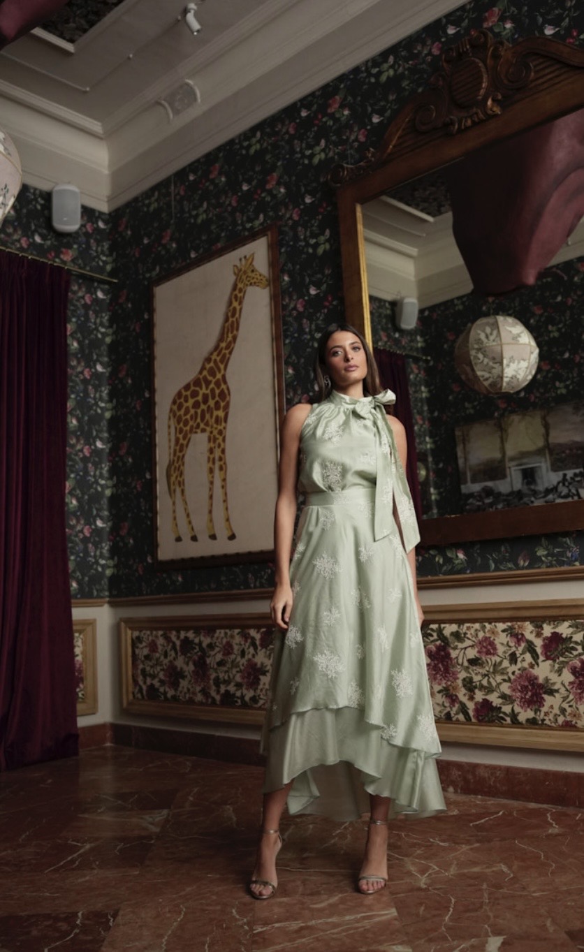 El Conjunto Taylor está confeccionado en voile bordado, un tejido ligero y sofisticado que aporta delicadeza al diseño. La falda de doble vuelo con bajo desigual añade movimiento y elegancia, mientras que el top sin mangas incorpora un delicado detalle de lazada, ofreciendo un acabado femenino y versátil.