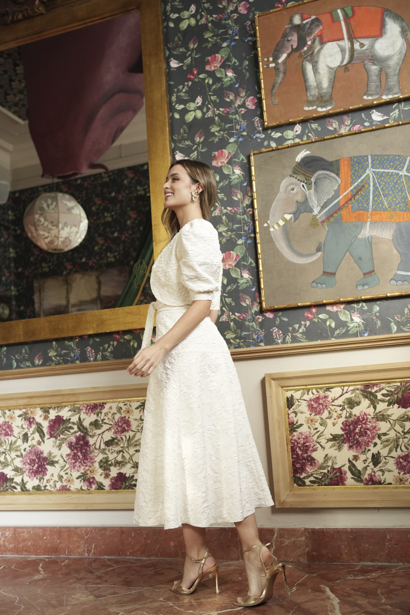 • Combínalo con sandalias de tacón alto en el mismo tono que las joyas o con salones clásicos destalonados en azul claro o tonalidades similares para aportar un toque dulce y sofisticado al look.